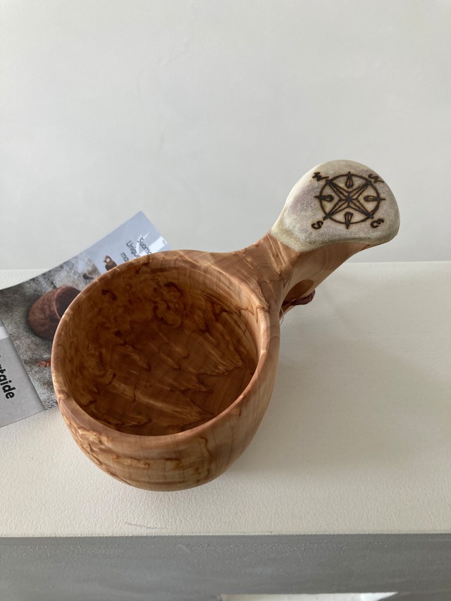 日本未入荷 パッカタイデ工房 Pahkataide ククサ コンパス柄 方位磁針柄 フィンランド産 kuksa ヴィサコイブ(visakoivu) カーリーバーチ エルク角飾り1つ穴ハンドル 160cc