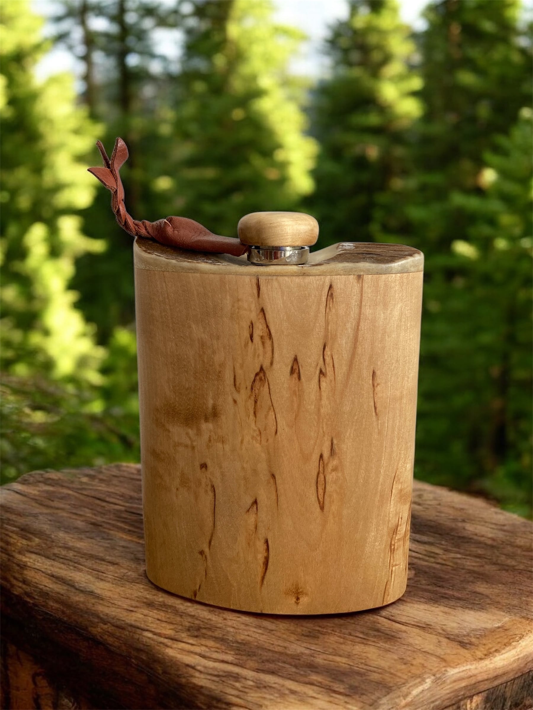 木製カバーが付いた優れたスクリューキャップは密閉性を保証し、本体と革紐で繋がれており、誤って紛失することはありません。