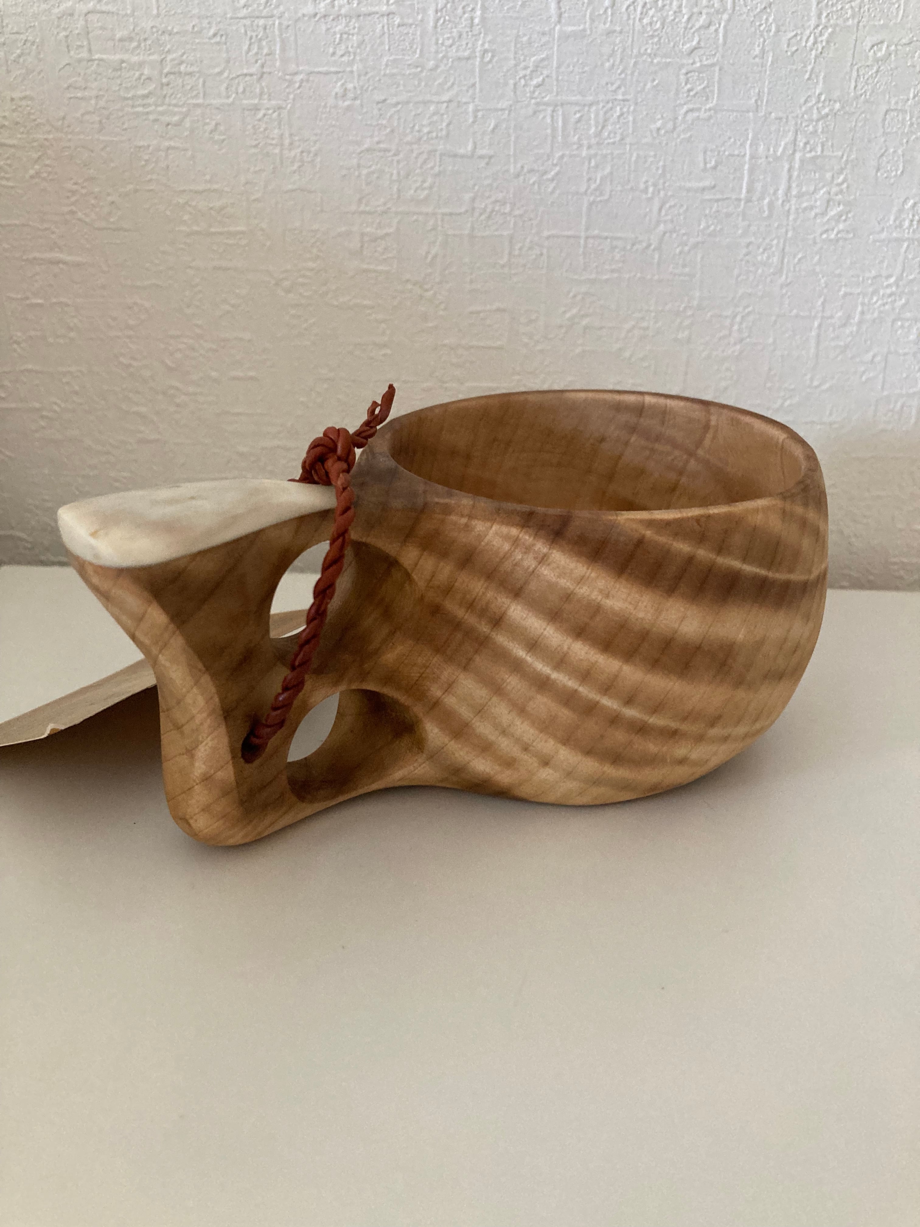・ククサの表面には蜜蝋が塗布されており、紙などの油を吸いやすいものに触れるとオイルが染みる場合がありますのでご注意ください。口にされても体に害はありません。使い始めは油が浮くことがありますが、品質に問題はありません。何度か洗うと落ち着いてきます。