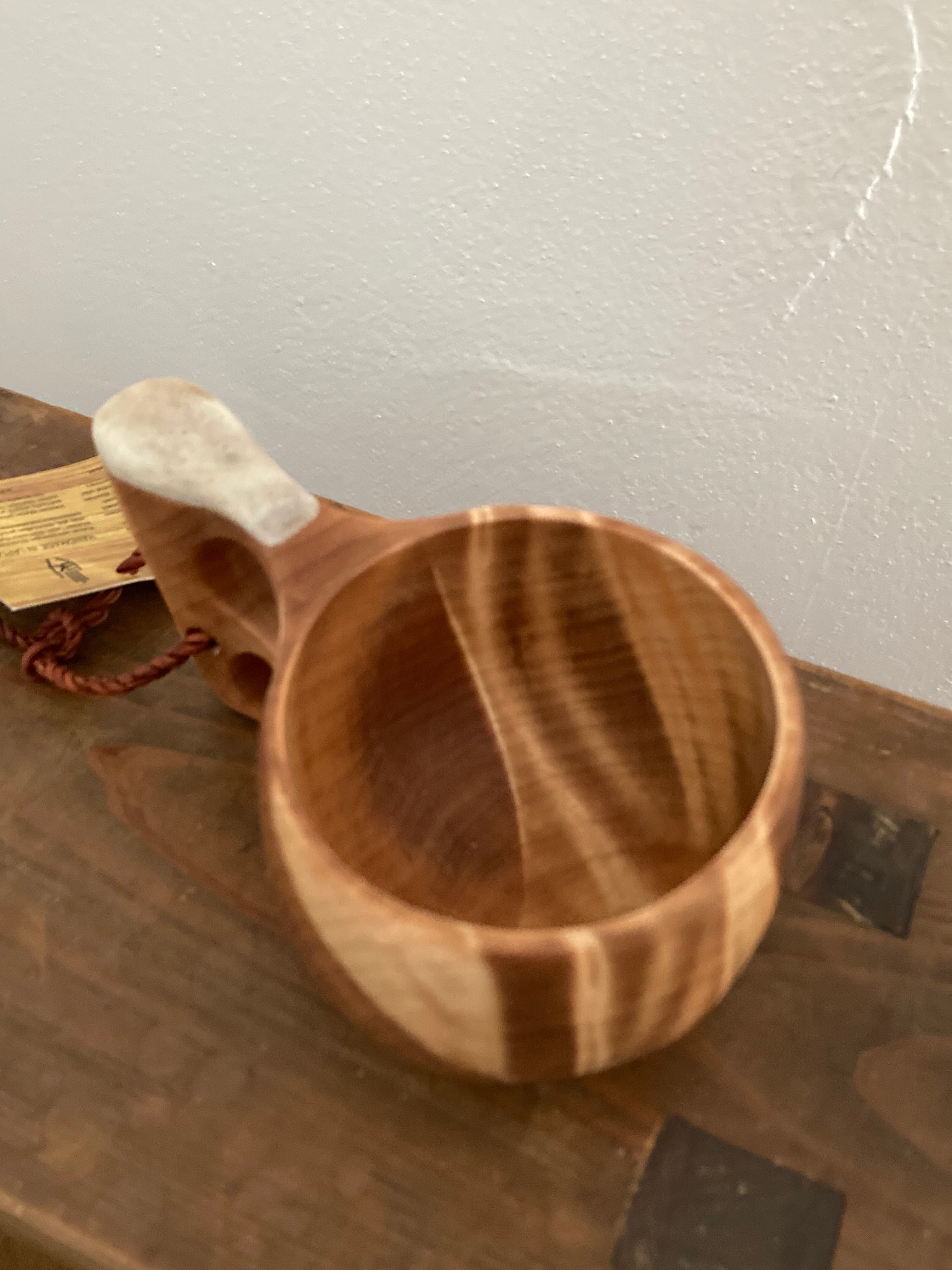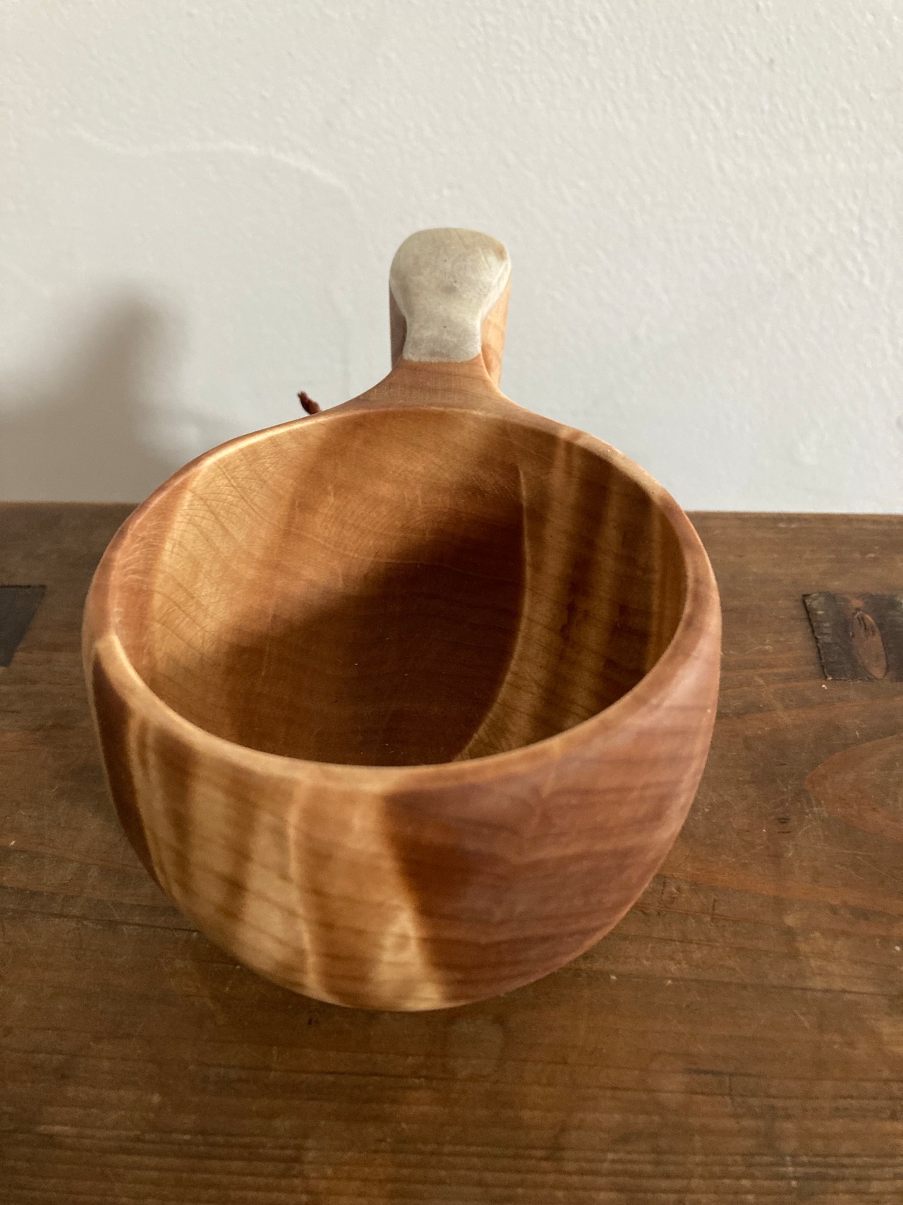・ククサの表面には蜜蝋が塗布されており、紙などの油を吸いやすいものに触れるとオイルが染みる場合がありますのでご注意ください。口にされても体に害はありません。使い始めは油が浮くことがありますが、品質に問題はありません。何度か洗うと落ち着いてきます。