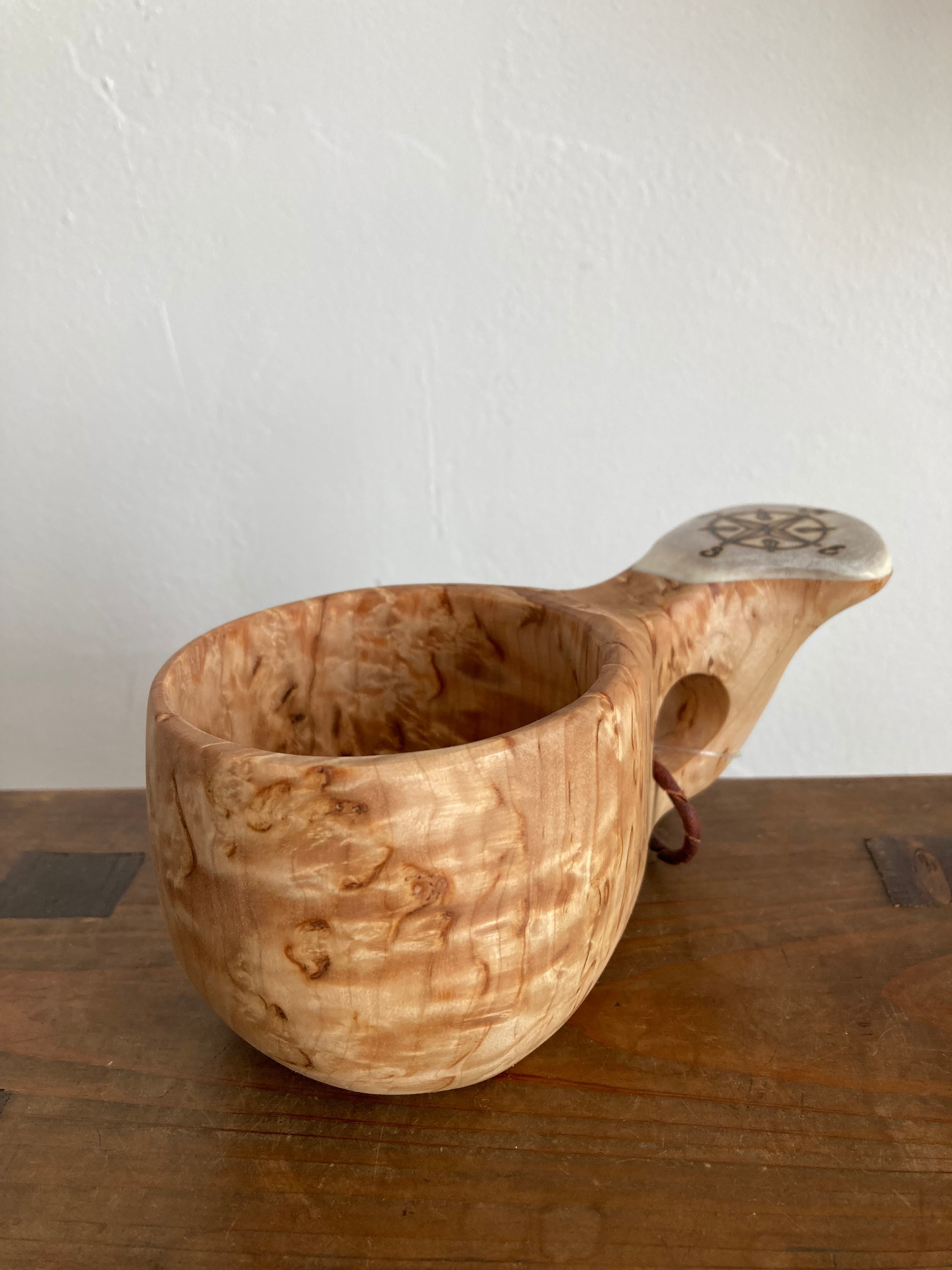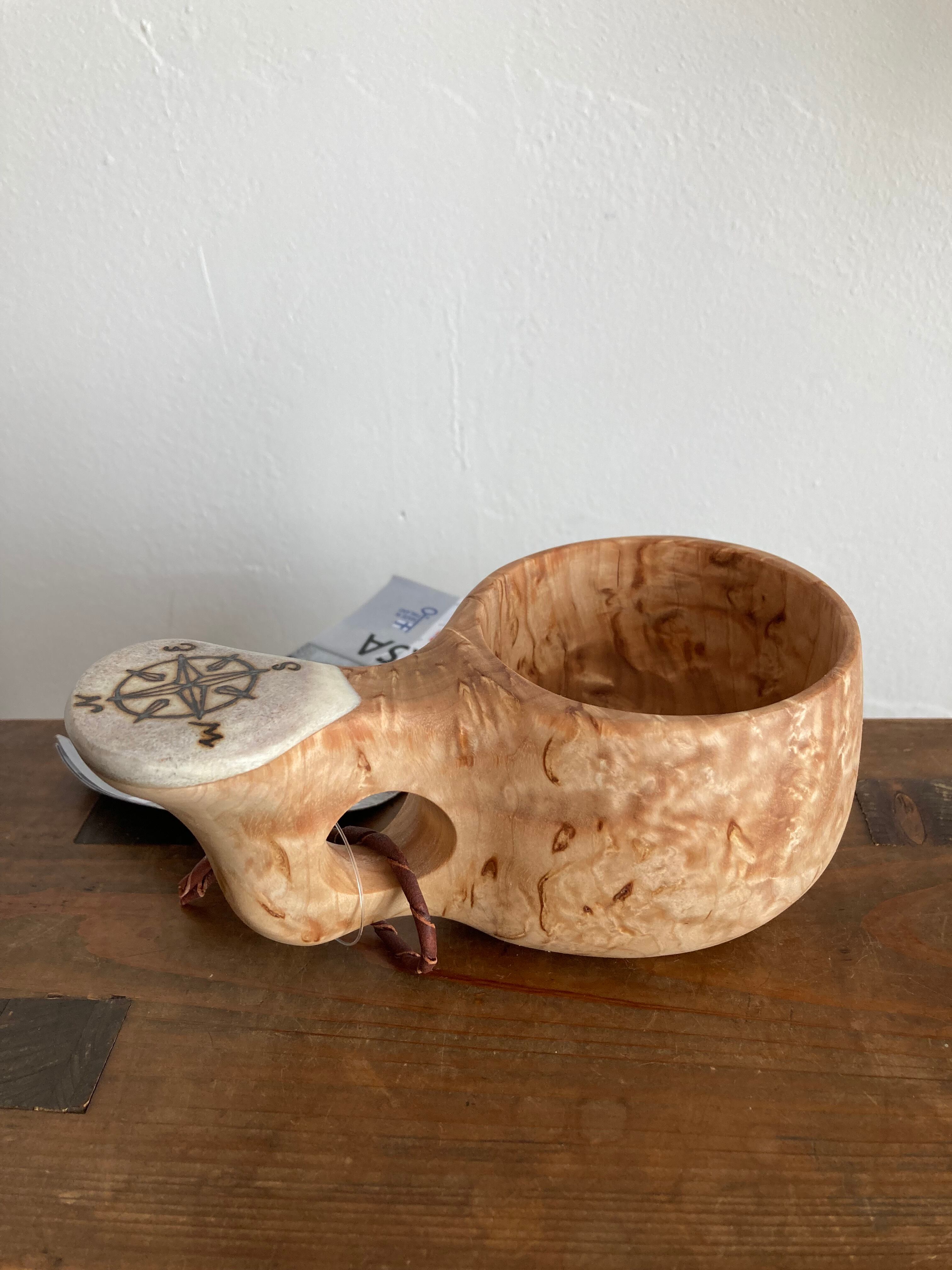日本では当店のみ取り扱い パッカタイデ工房 Pahkataide ククサ コンパス柄 方位磁針柄 フィンランド産 kuksa ヴィサコイブ(visakoivu) カーリーバーチ エルク角飾り1つ穴ハンドル 160cc