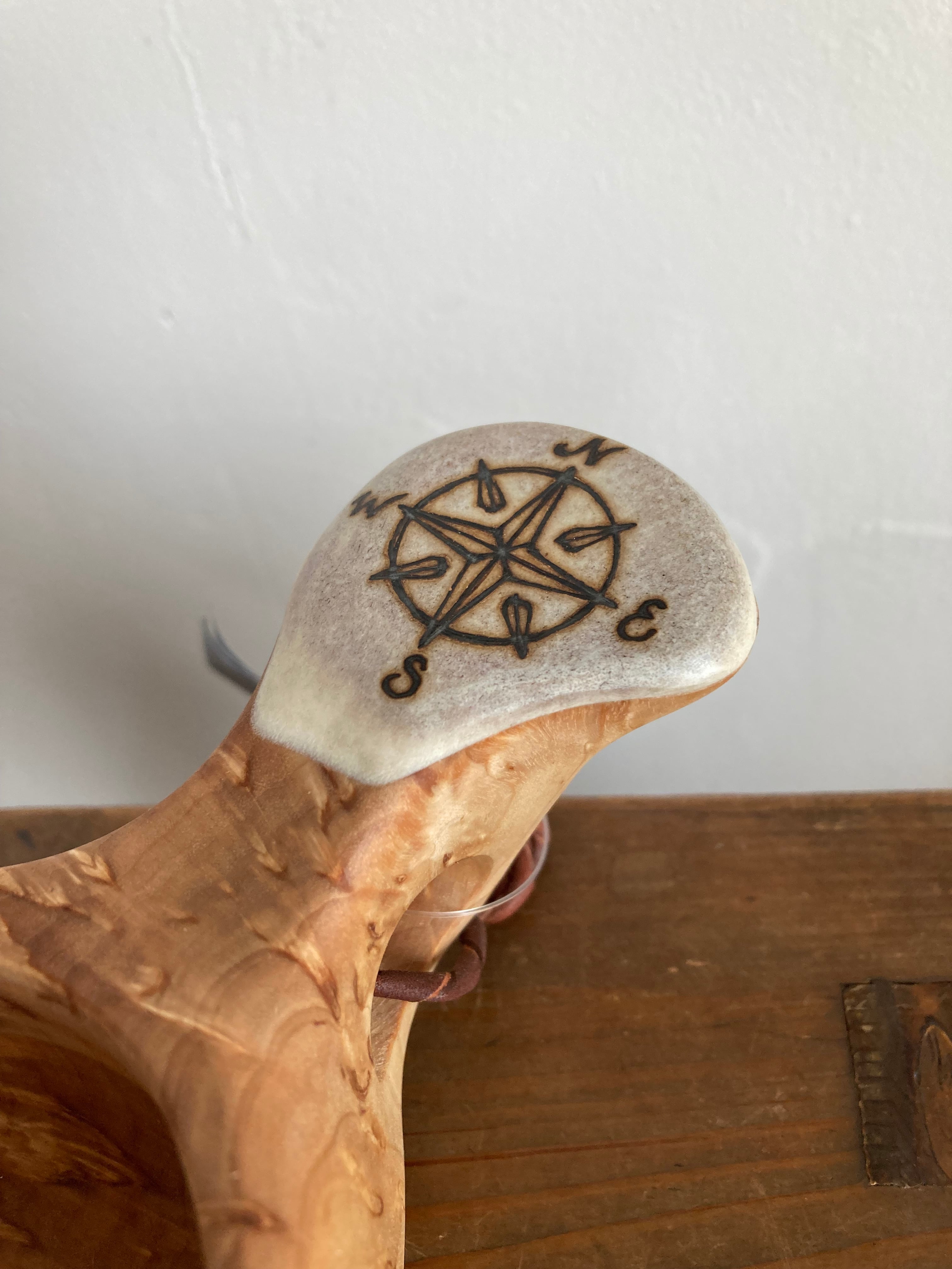 ■材 質:白樺VISAKOIVU(ヴィサコイブ/英名 カーリーバーチ)、トナカイの革、エルクの角(日本名:ヘラジカ)方位磁針の絵柄彫刻