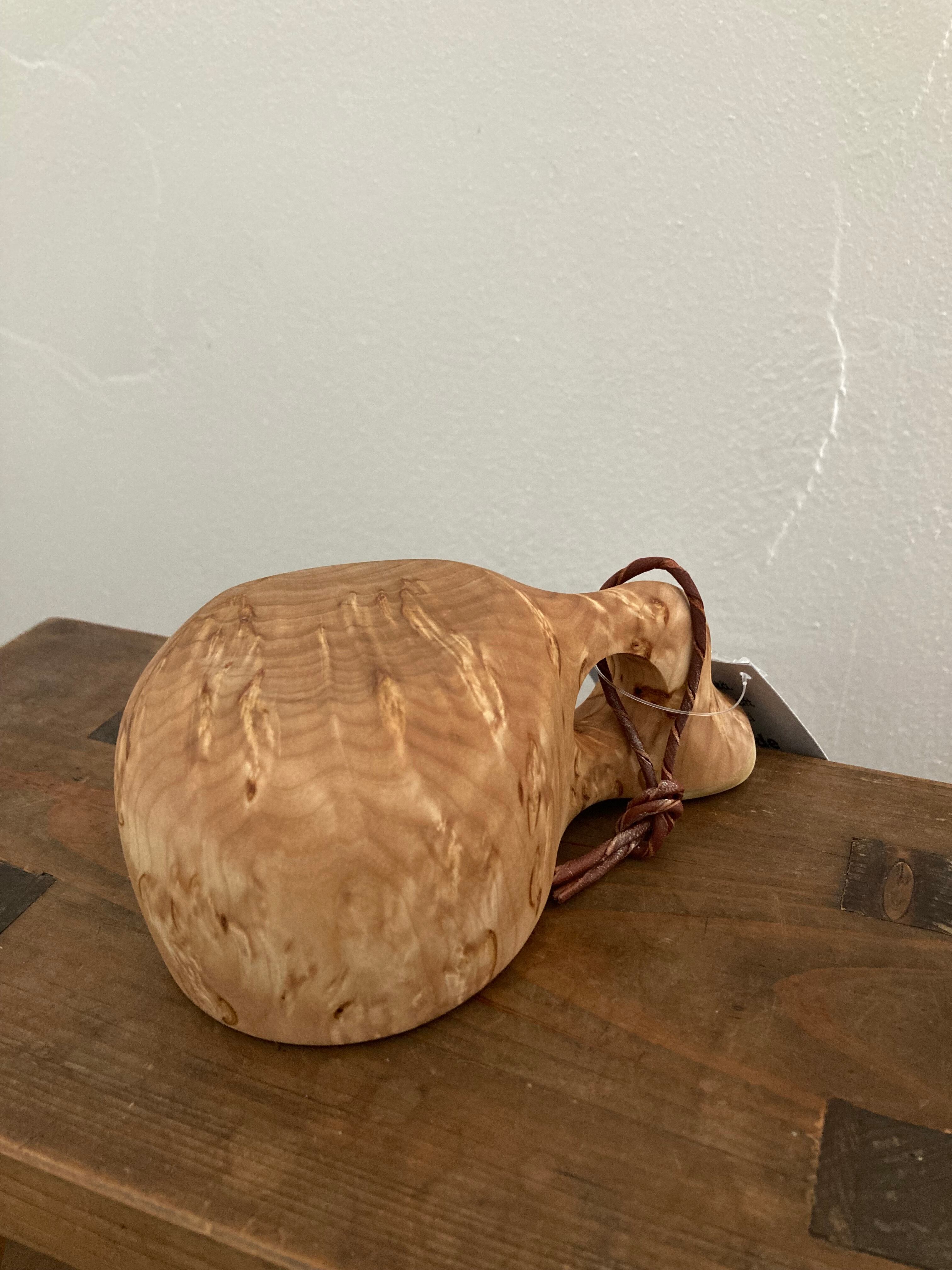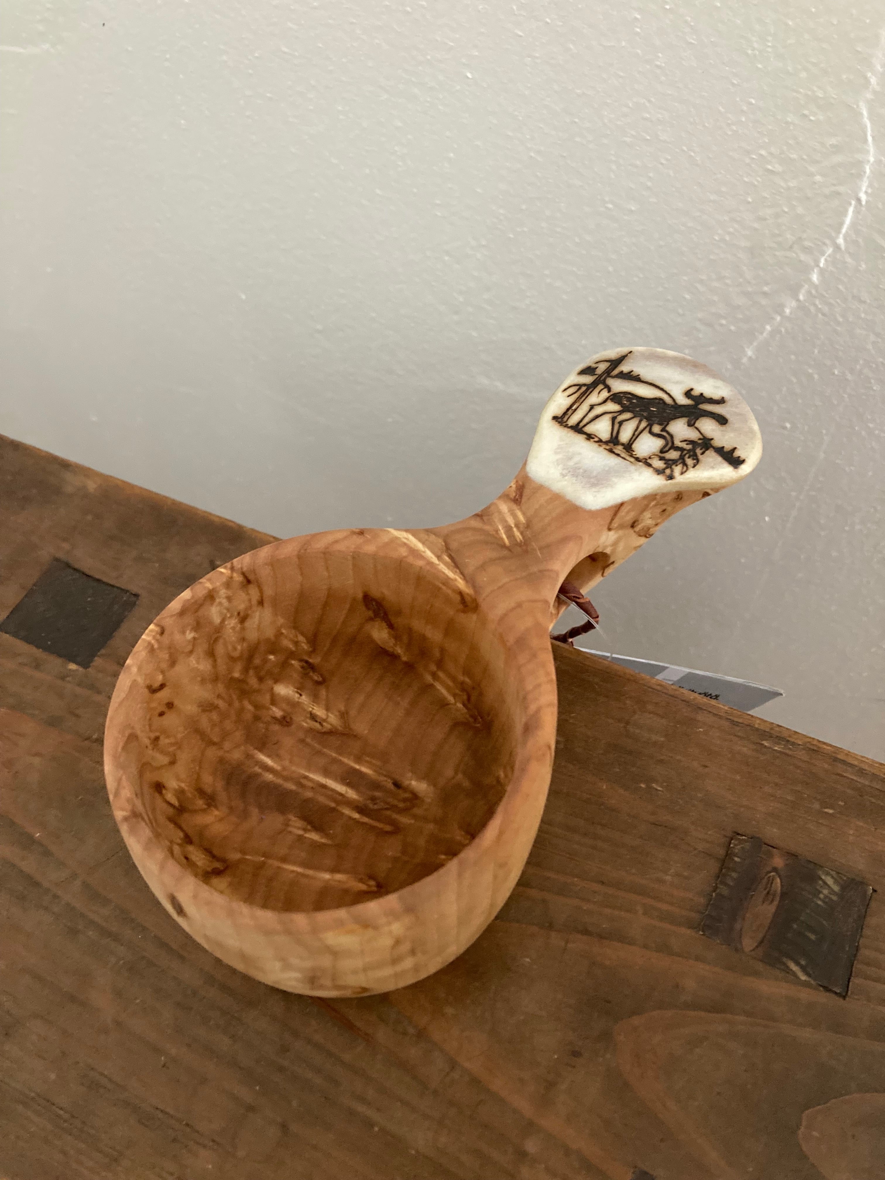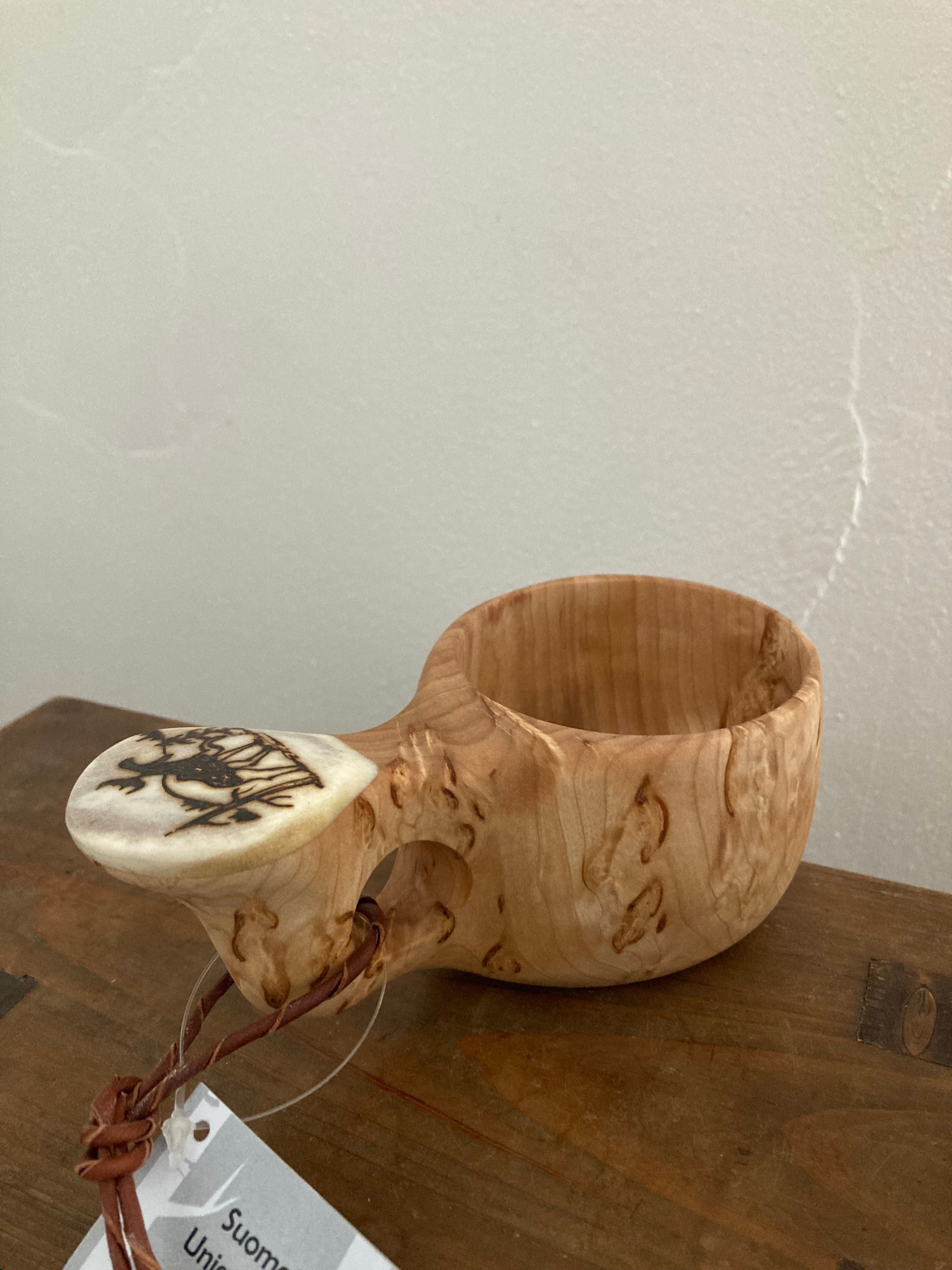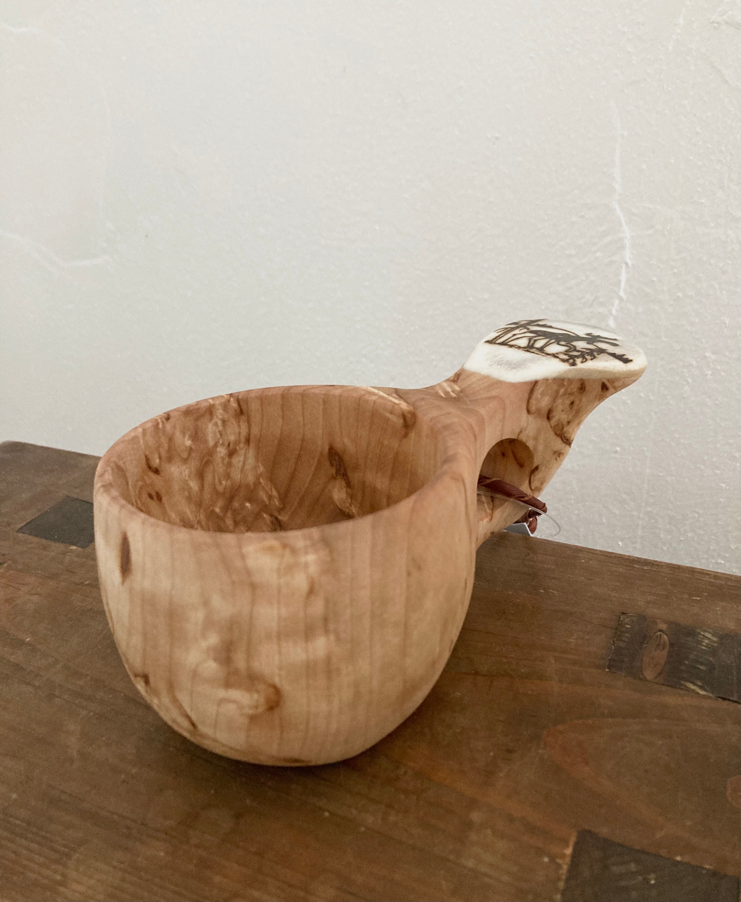 パッカタイデ工房 Pahkataide ククサ ヘラジカ ムース カリブー フィンランド産 kuksa ヴィサコイブ(visakoivu) カーリーバーチ エルク角飾り1つ穴ハンドル 160cc