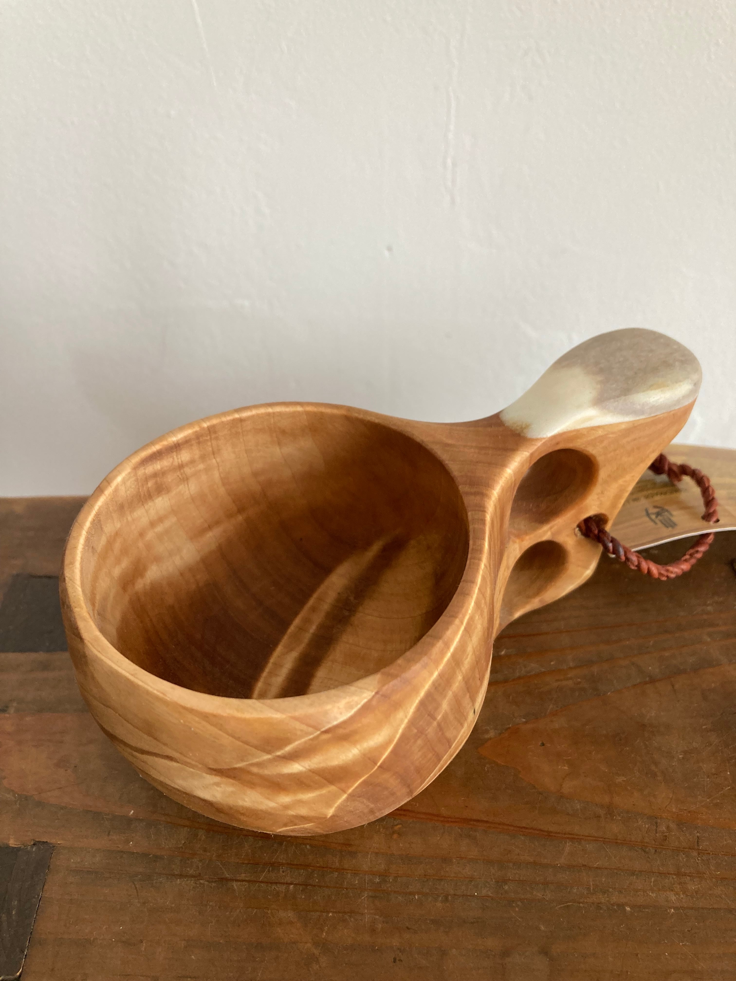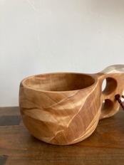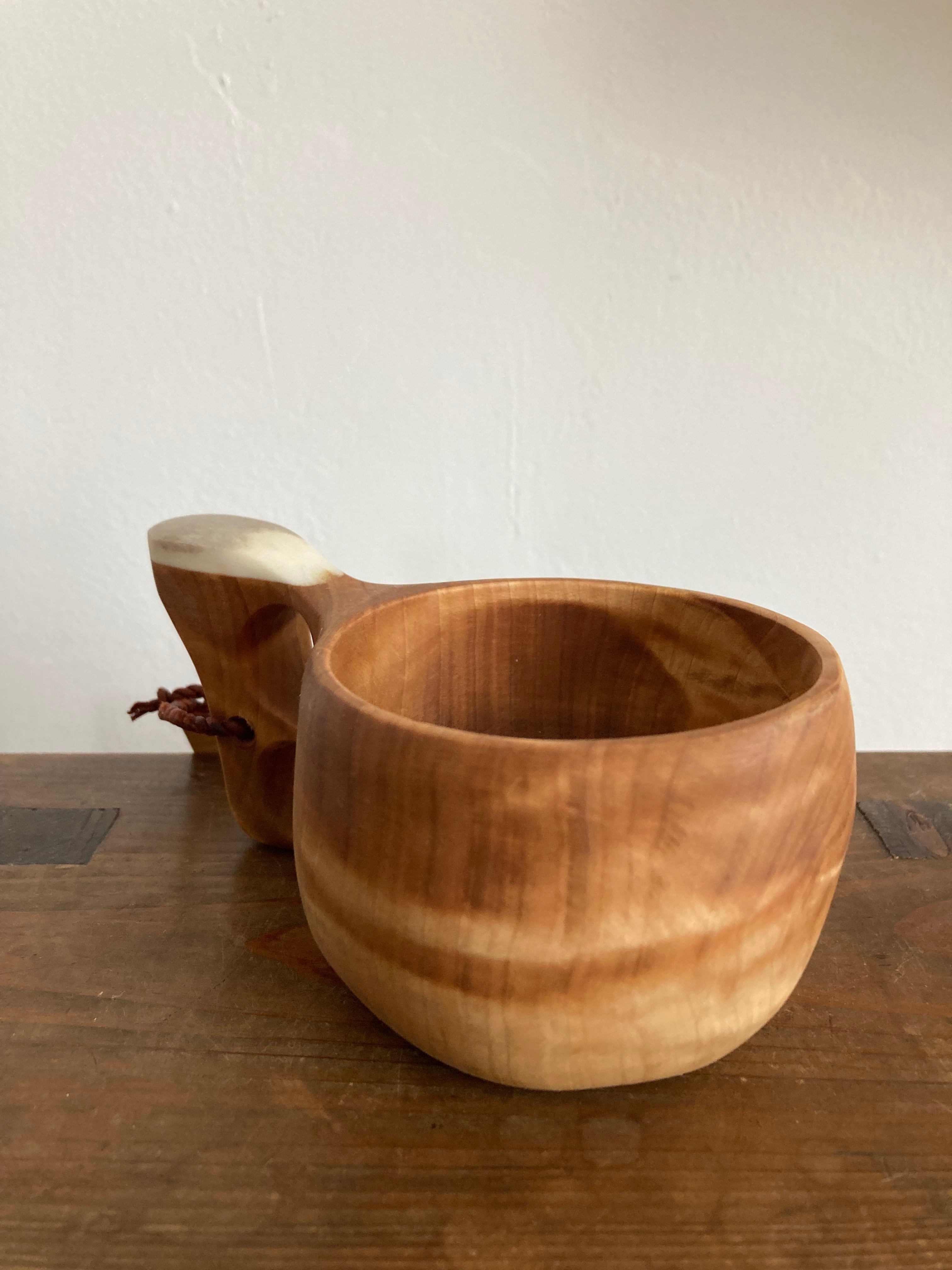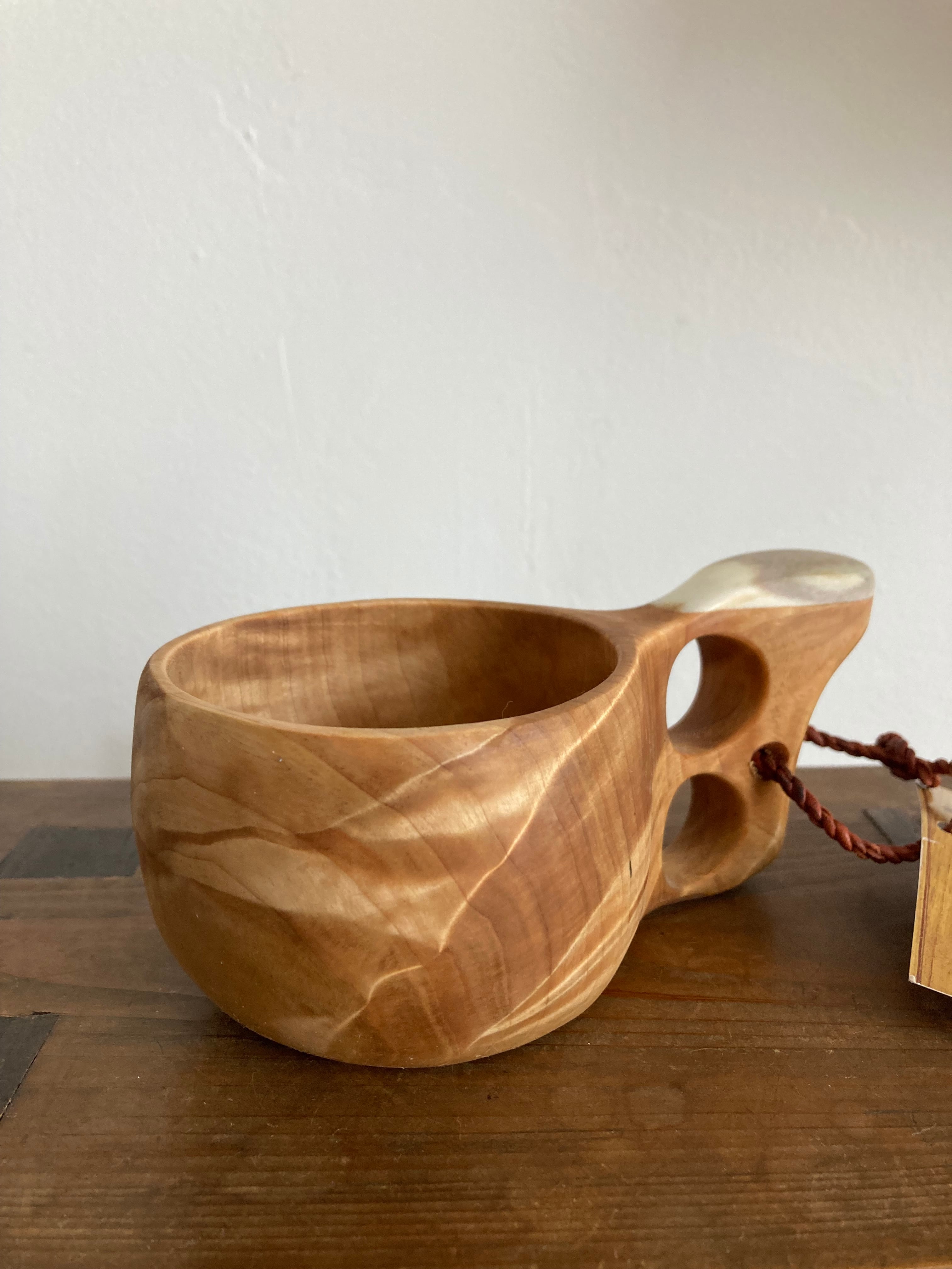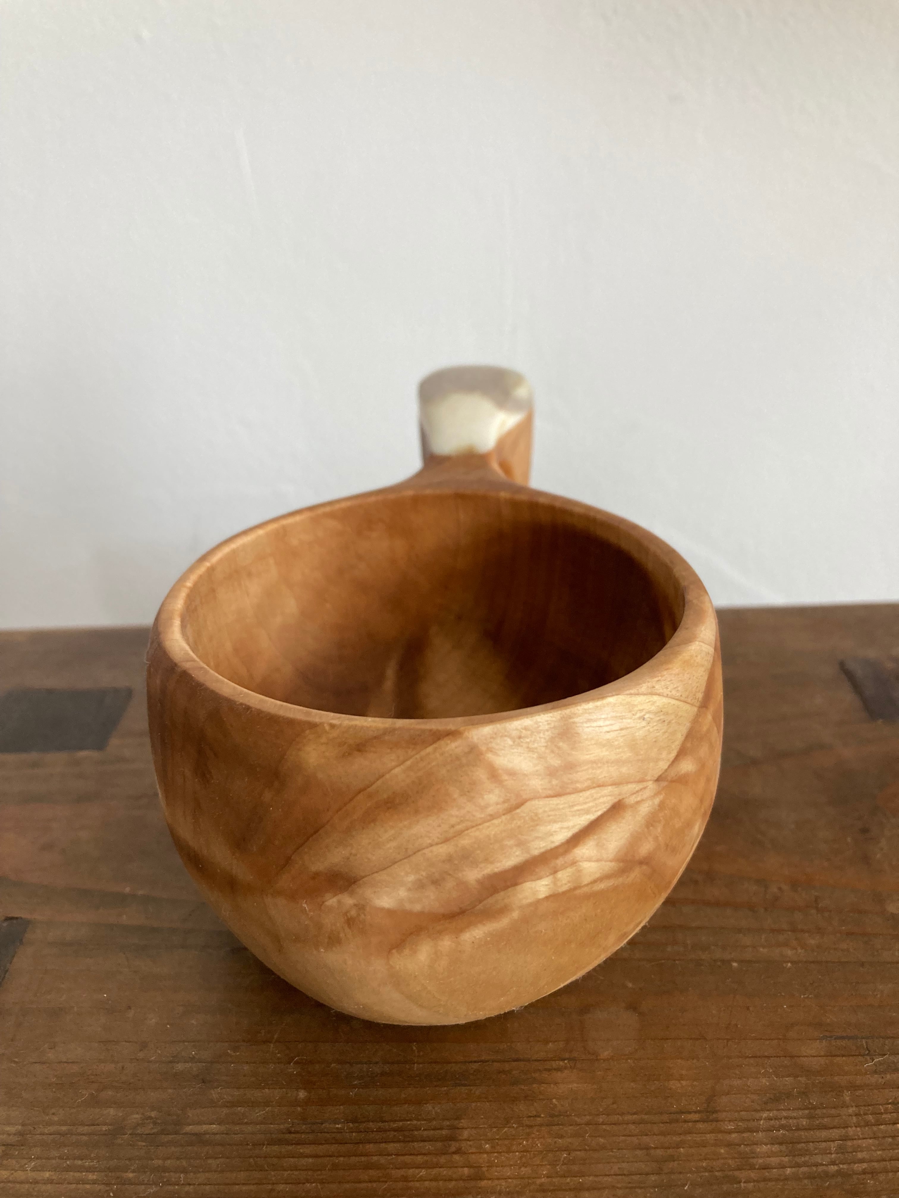 ・ククサの表面には蜜蝋が塗布されており、紙などの油を吸いやすいものに触れるとオイルが染みる場合がありますのでご注意ください。口にされても体に害はありません。使い始めは油が浮くことがありますが、品質に問題はありません。何度か洗うと落ち着いてきます。
