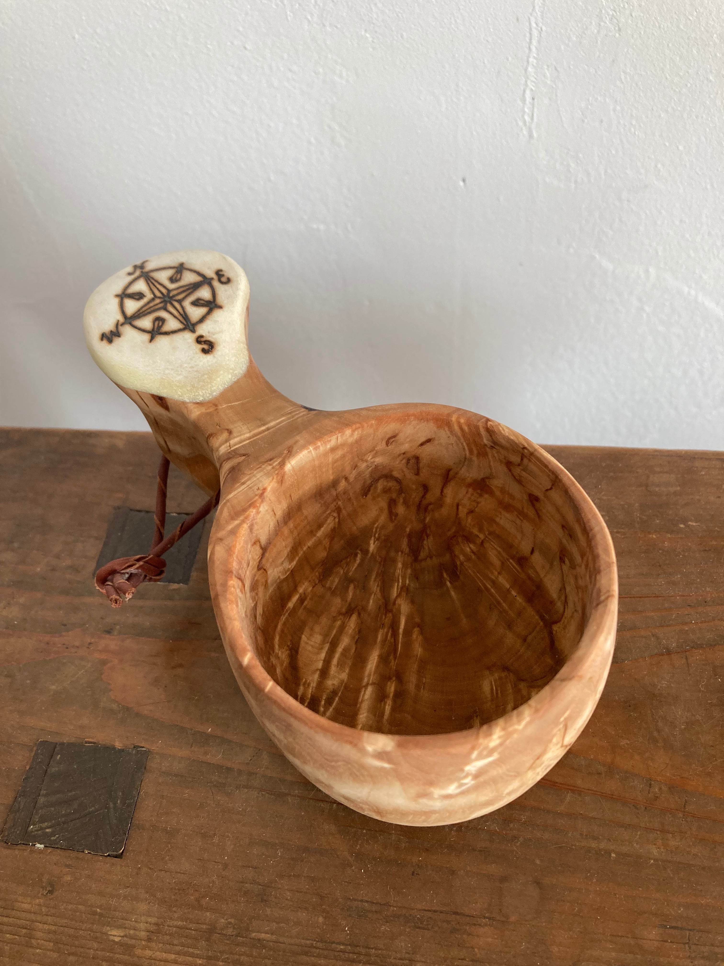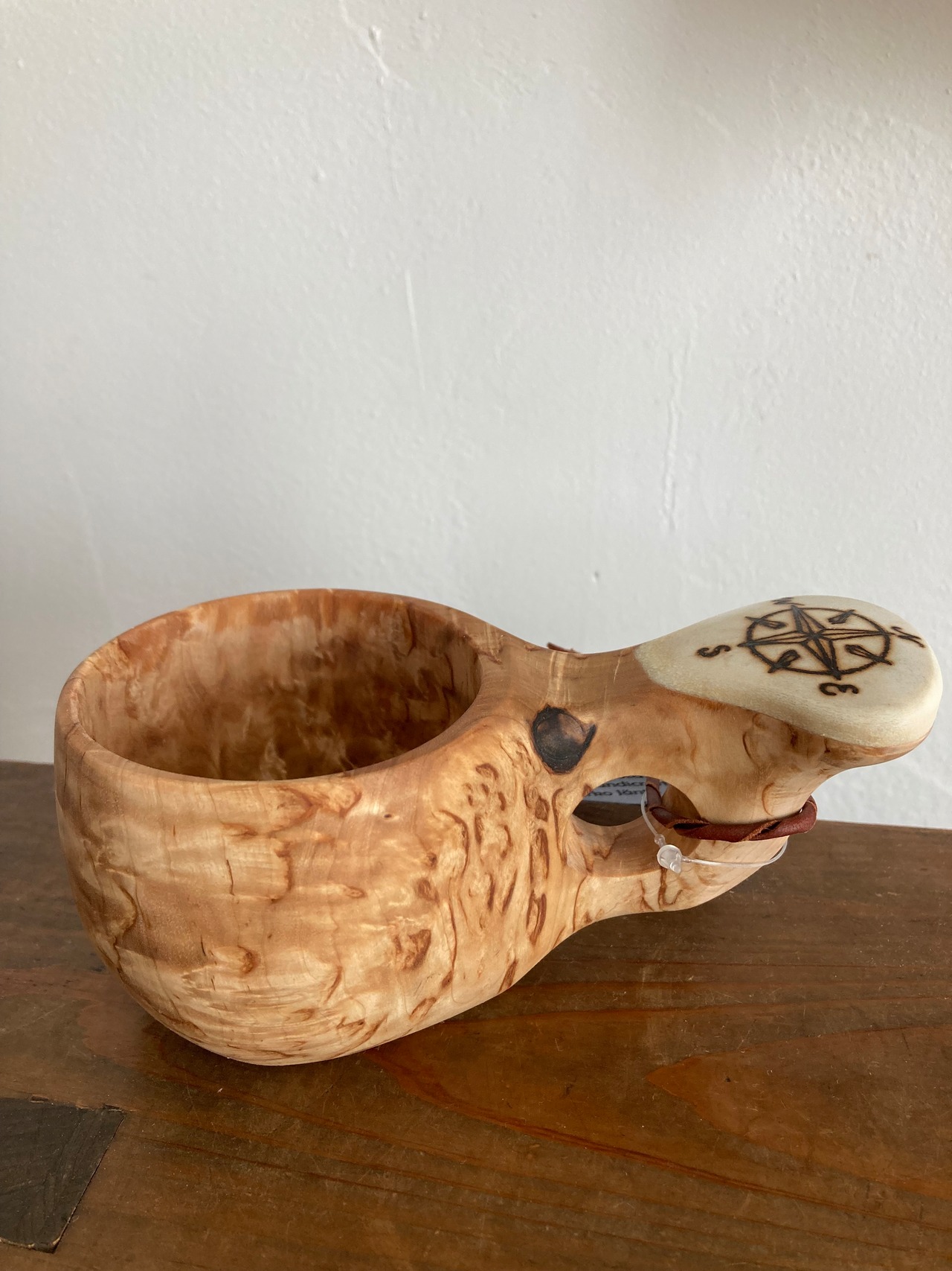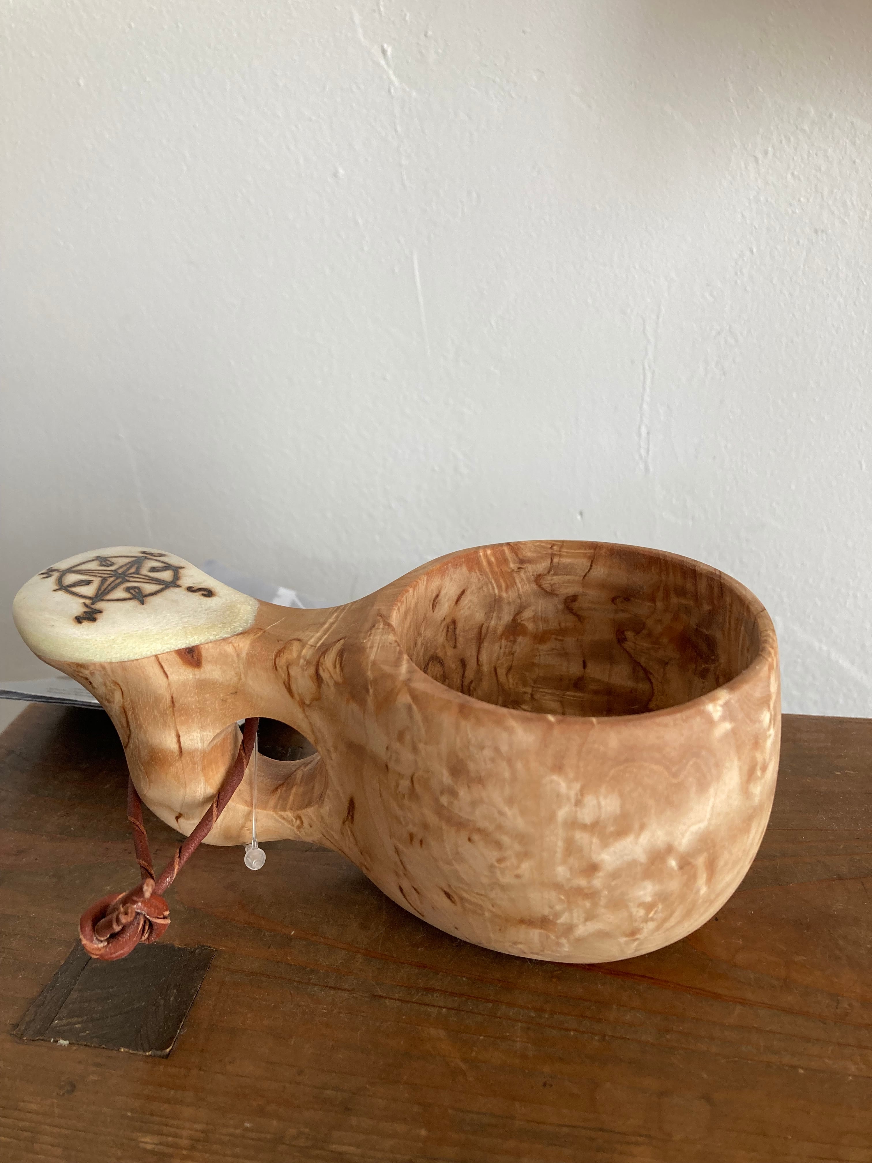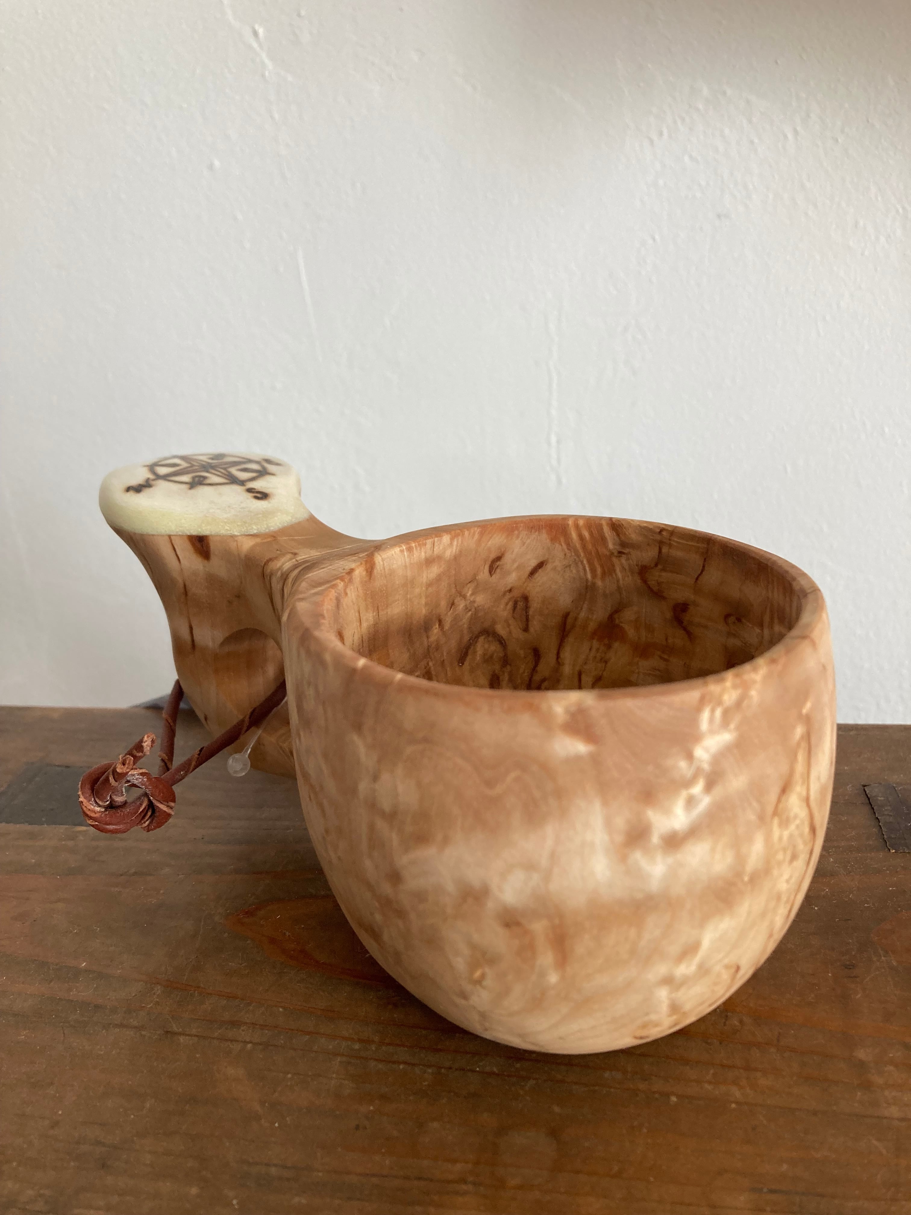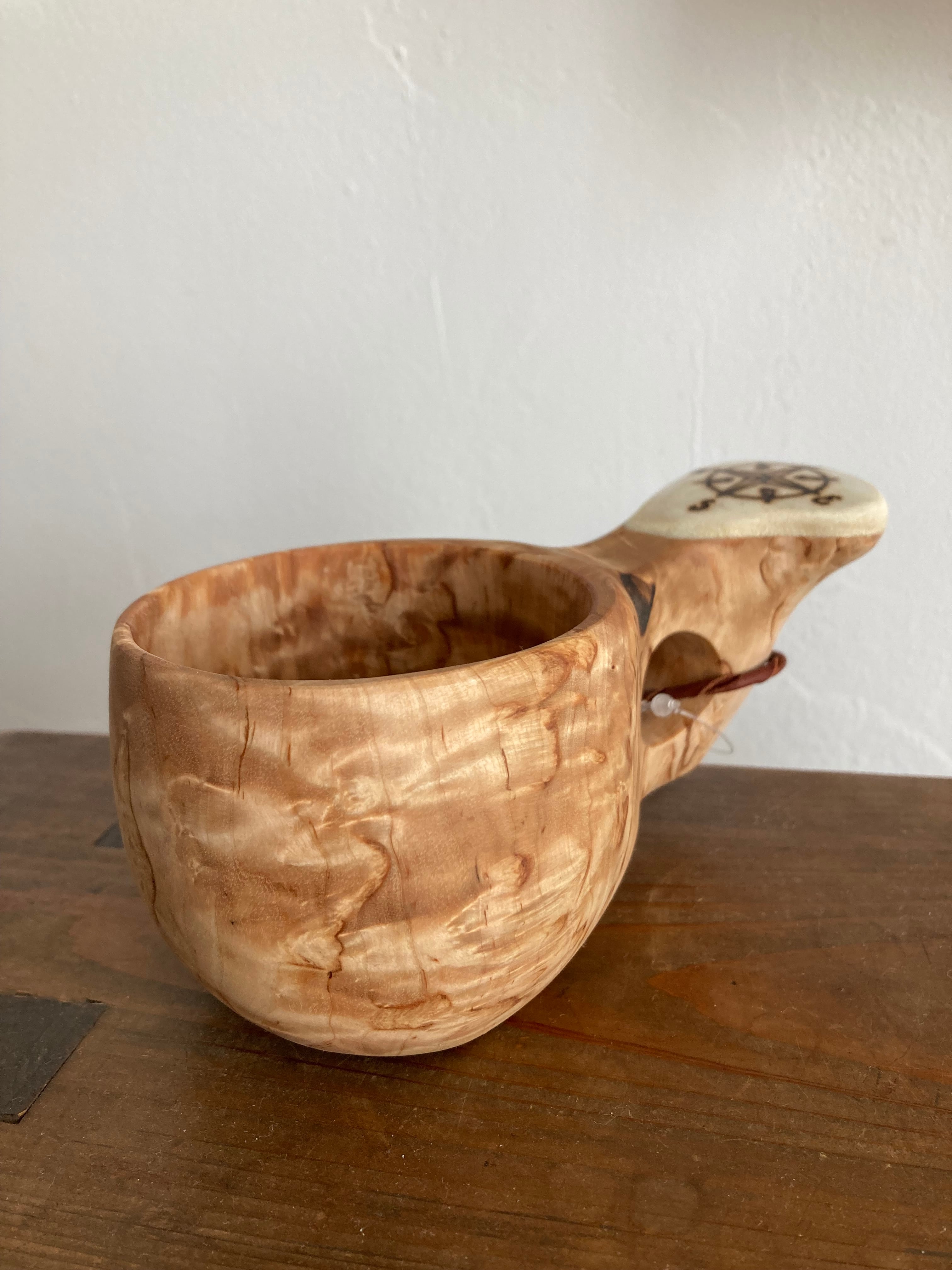 日本では当店のみ取り扱い 上杢目 パッカタイデ工房 Pahkataide ククサ コンパス柄 フィンランド産 kuksa ヴィサコイブ(visakoivu) カーリーバーチ エルク角飾り1つ穴ハンドル 160cc サーミ ラップランド